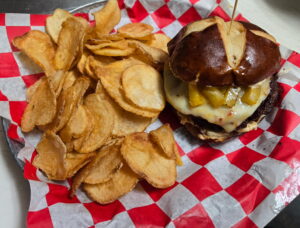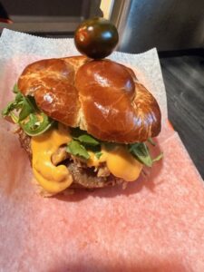 A brat burger topped with shredded pork Carnita, fried onions, arugula, beer cheese sauce on a pretzel bun with a fig pepper spread.