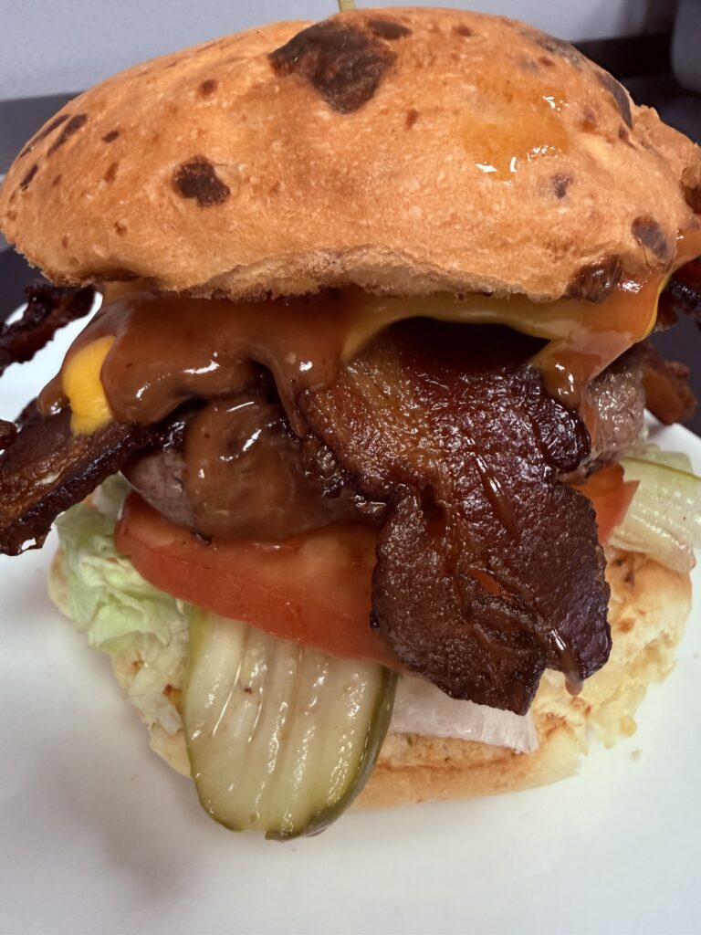 A 1/2 pound chuck and brisket burger patty, Meat Lodge thick cut bacon, cottage bacon, Italian pancetta, New School American cheese, BBQ aioli, shredded lettuce, tomato, and pickle planks on a toasted onion cheddar bun.